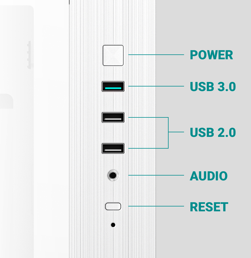 侧面 I/O 面板提供 USB 3.0、双 USB 2.0 及音频接口,轻松连接设备。