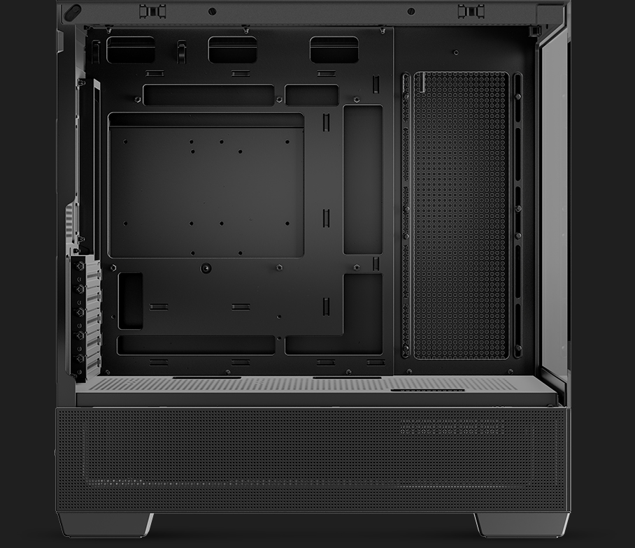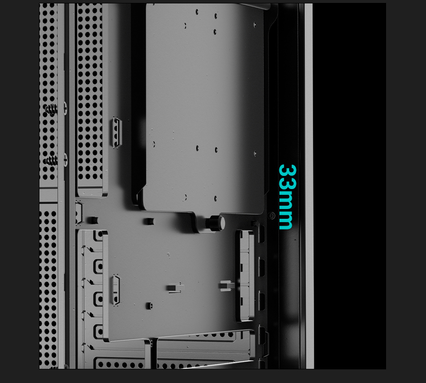 专为容纳高端硬件打造,支持最长 410mm 的显卡、最长 250mm 的 ATX 电源以及最高 176mm 的 CPU 散热器,为高性能组件提供广泛兼容性。预留 33mm 背部理线空间,确保布线整洁有序。