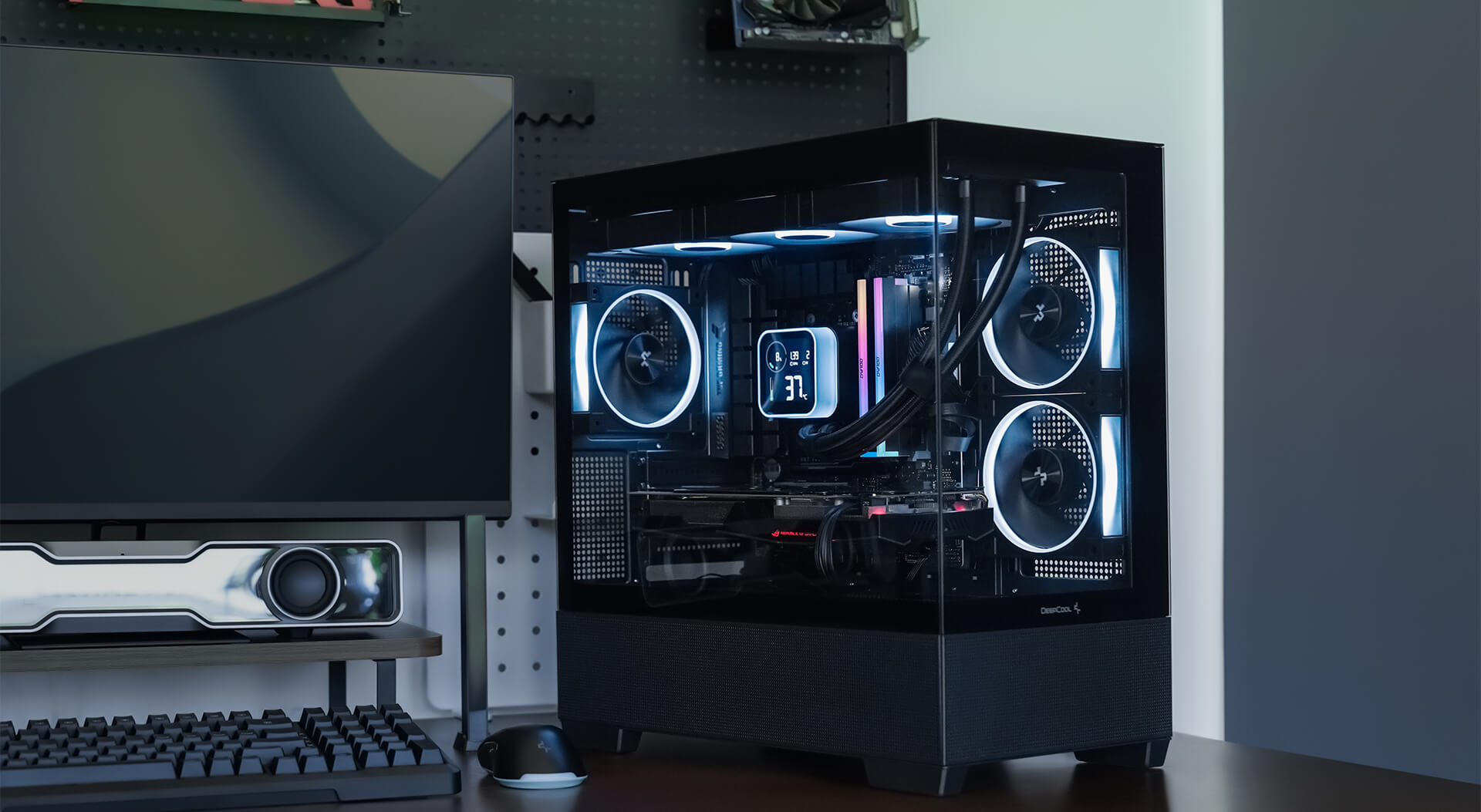 CG380 3F 预装了两把侧置反叶 PWM ARGB 风扇和一个后置标准风扇,转速范围为 300–1500 RPM。凭借标志性的灯光风格,开箱即可呈现生动效果,并可通过主板或内置的 LED 开关轻松控制。