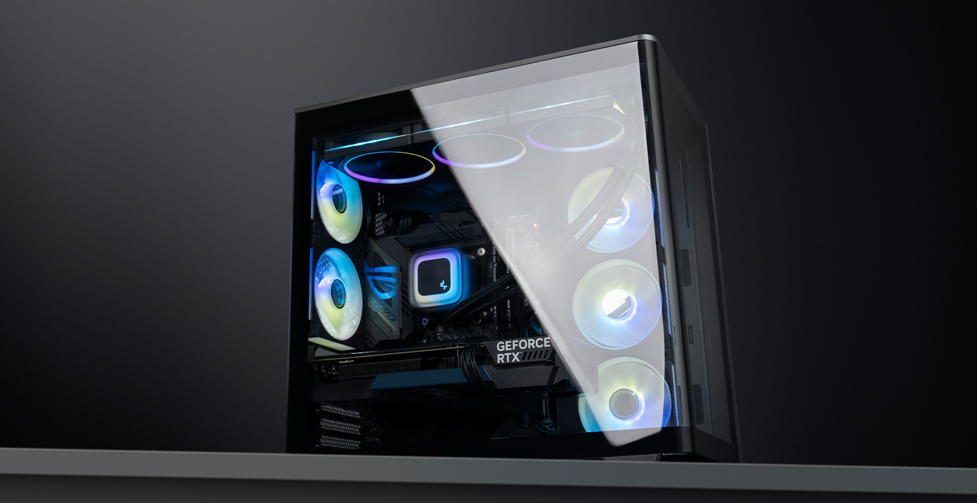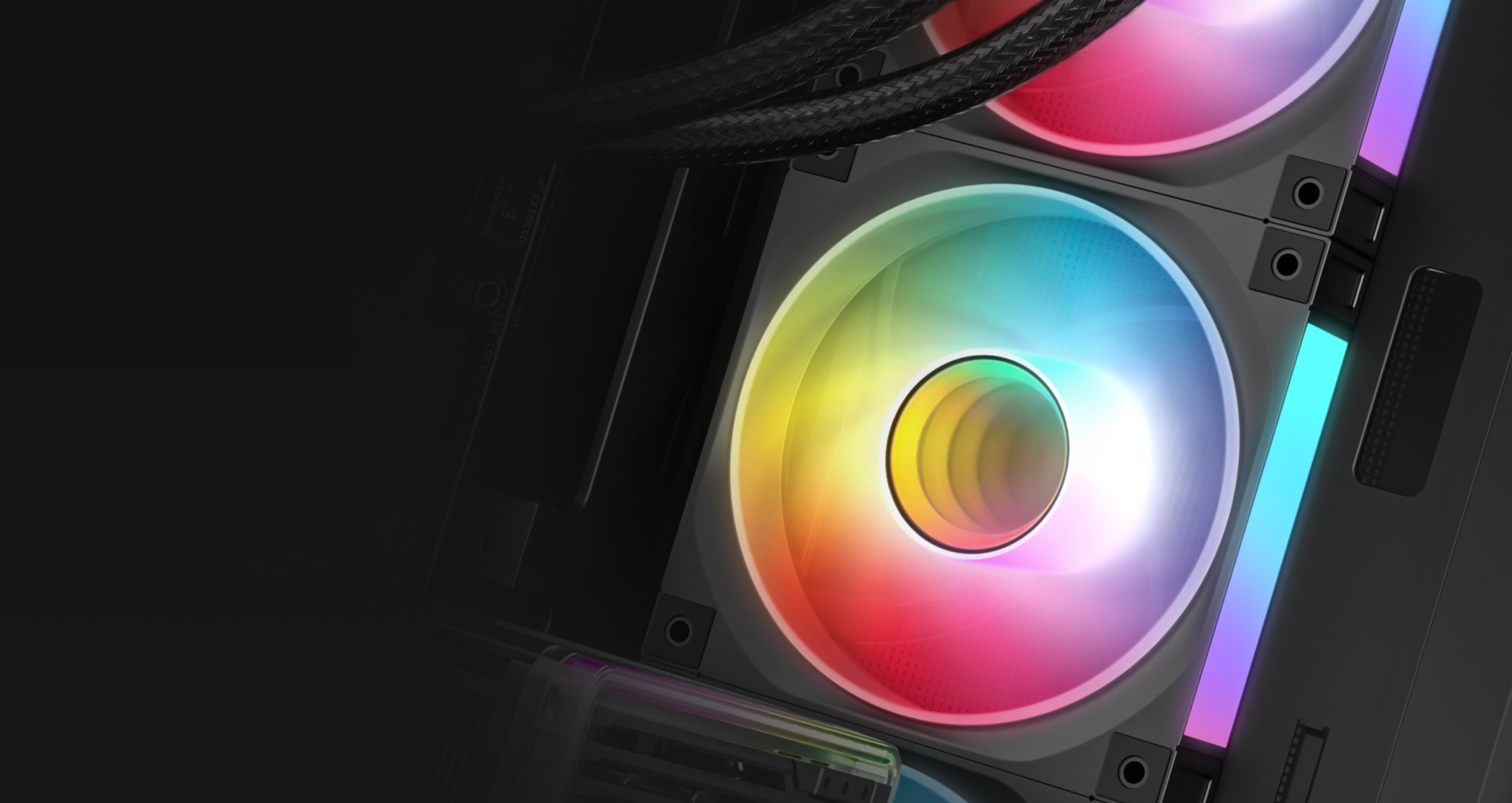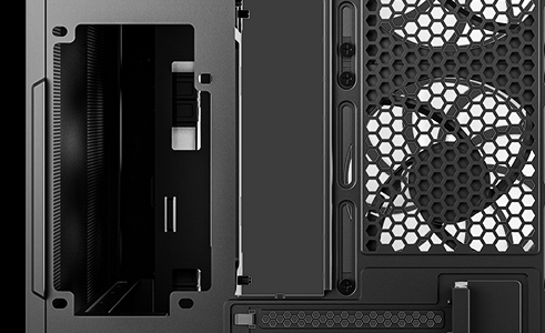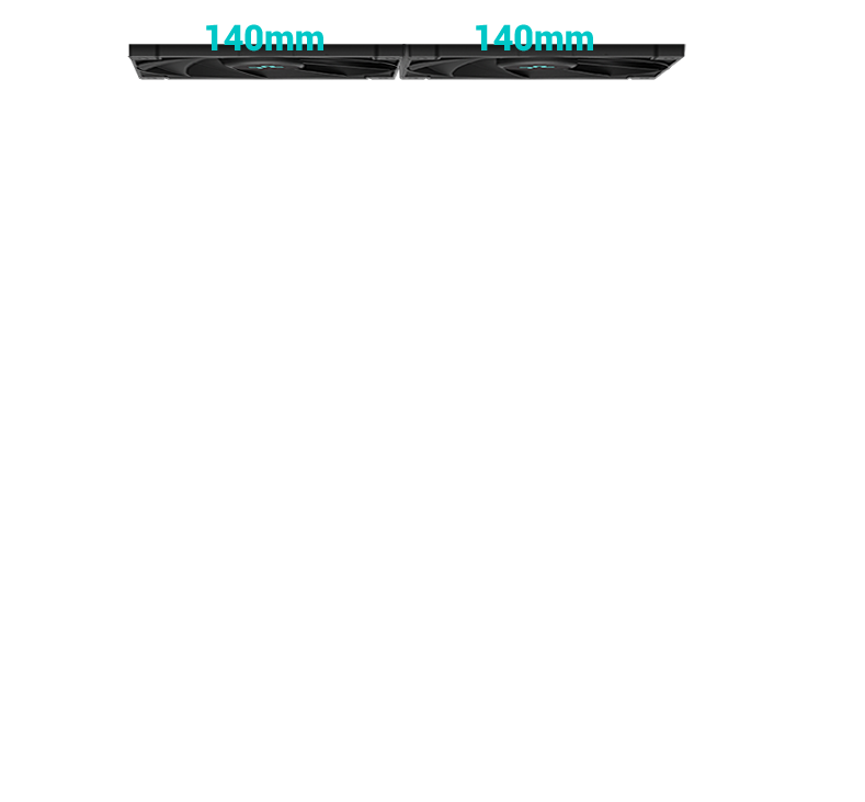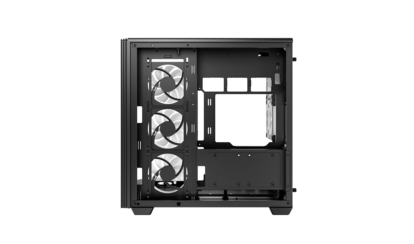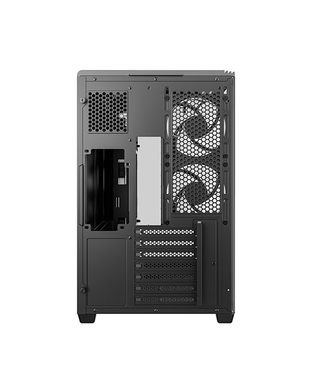 CG590U 5F尾部预装双风扇,增大箱体出风量,能更有效加速箱体内积热排出。侧面预装三把反叶120mm ARGB风扇,组成强劲水平风道,即刻释放散热潜力与光影魅力。