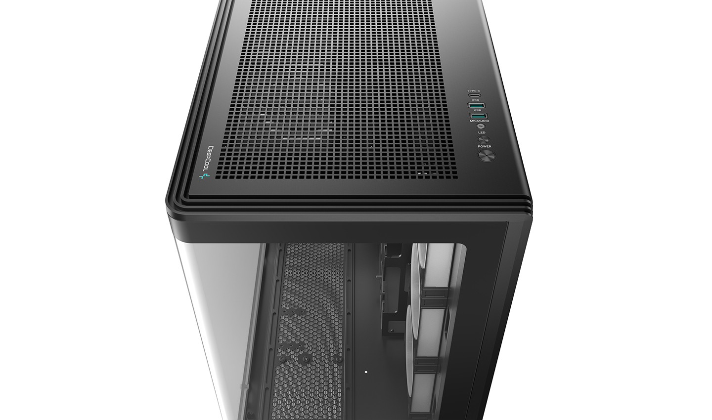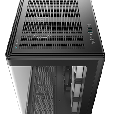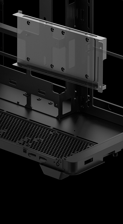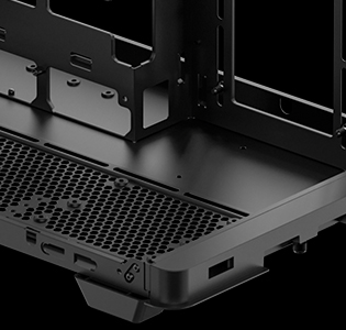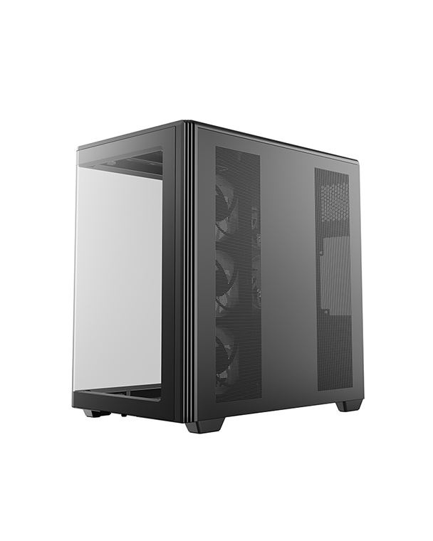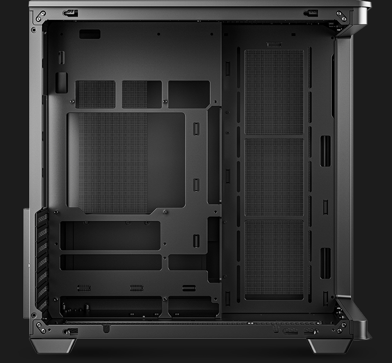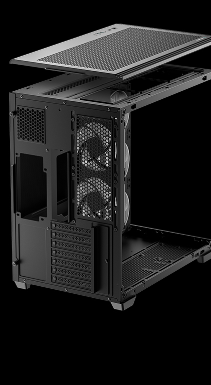 双舱结构将电源与硬盘仓隔离至独立散热区域,确保显卡进风路径通畅无阻。顶部与侧面配备大面积网孔面板,全面提升机箱通风效率。