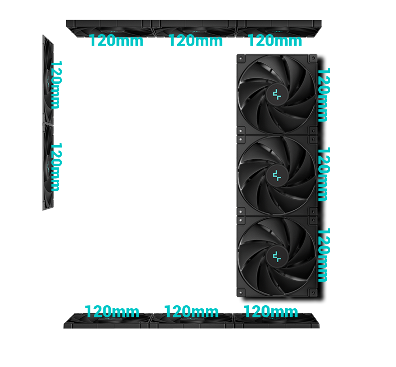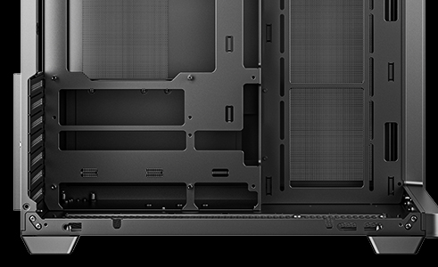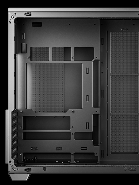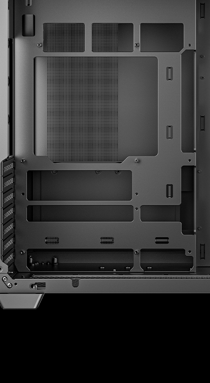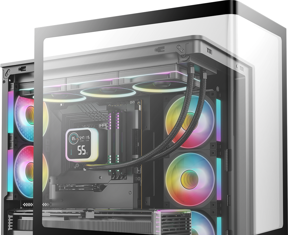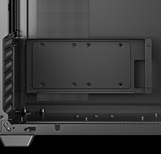 CG590U 5F提供多元散热方案,支持在顶部、侧面或底部安装360mm水冷排。纯风冷模式下最多可安装11把风扇,打造全方位高效风道系统。