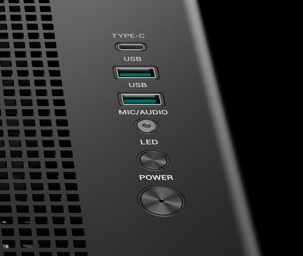 顶部I/O面板集成了两个USB 3.0接口、一个Gen2 Type-C接口以及复合音频/麦克风插孔,日常连接便捷易用。