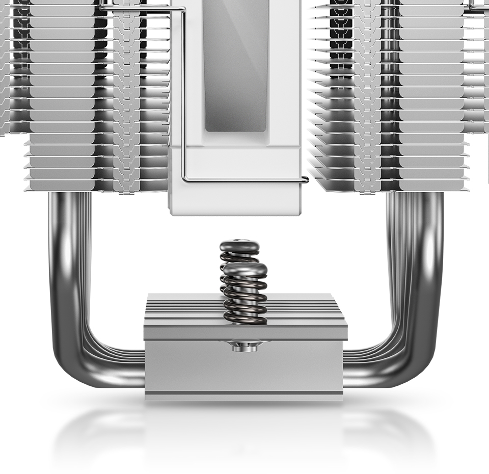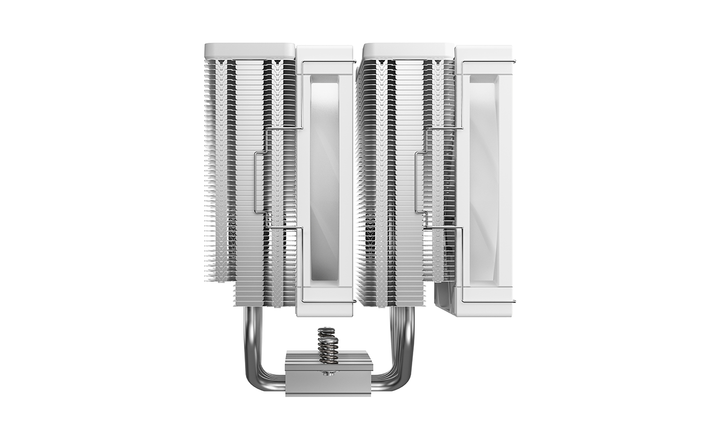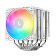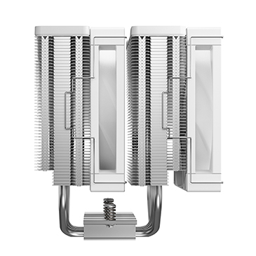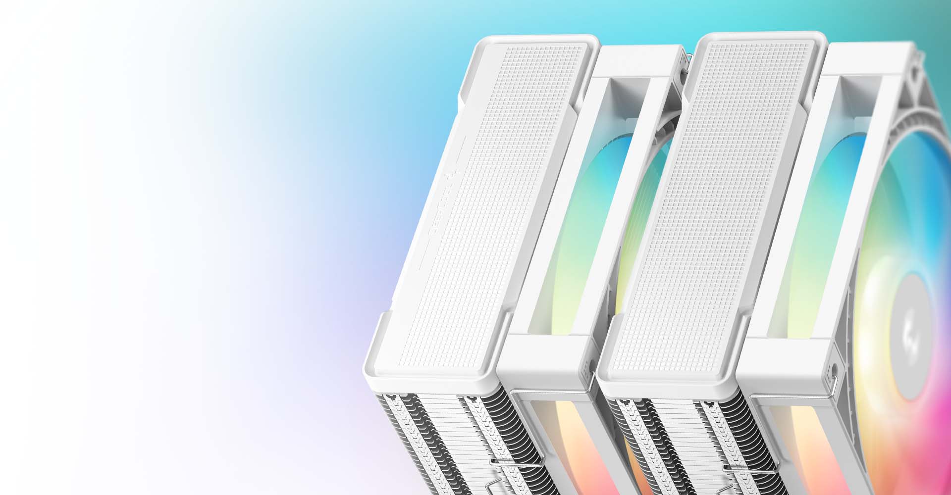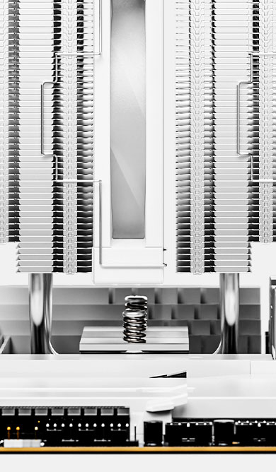 大霜塔白 ARGB FORINTEL凭借第二代升级技术,为双塔风冷散热器树立新标杆,带来性能提升与焕然一新的硬核外观。六根热管嵌入高密度双塔散热鳍片组,搭配两颗经过精准调校的120mm PWM ARGB风扇,可输出强劲风量并实现高效热传导。