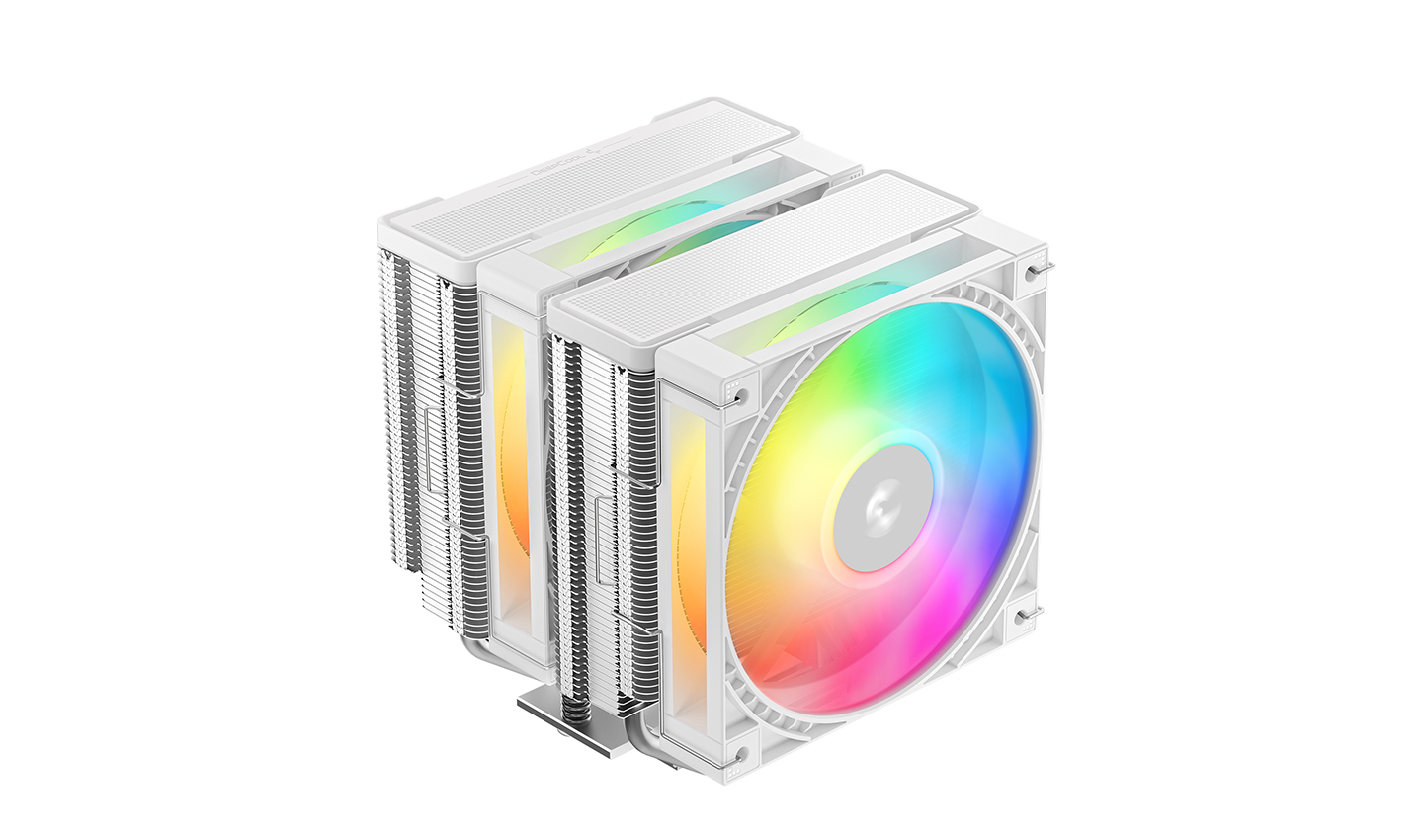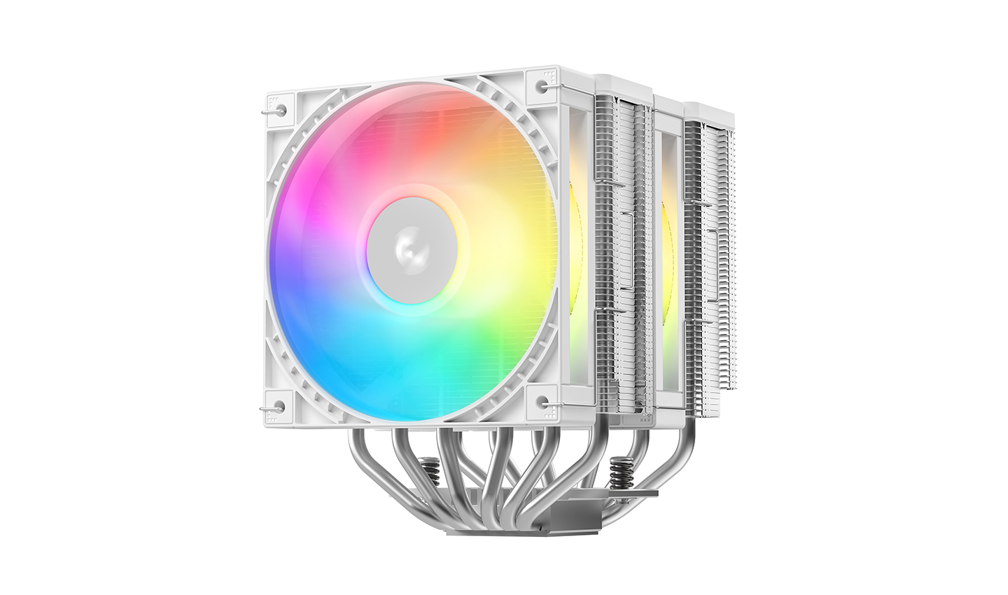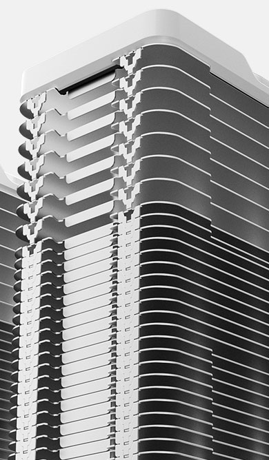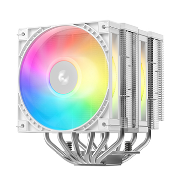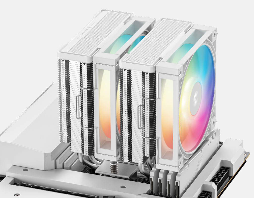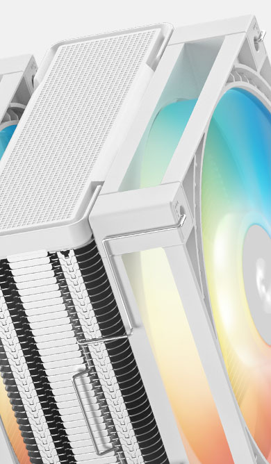 大霜塔白 ARGB FORINTEL延续上一代经典风格,同时升级家族化矩阵风格装饰顶盖,质感更出众。传承经典六热管双塔结构,镂空边框设计的ARGB风扇,助力打造动感氛围光效主机。