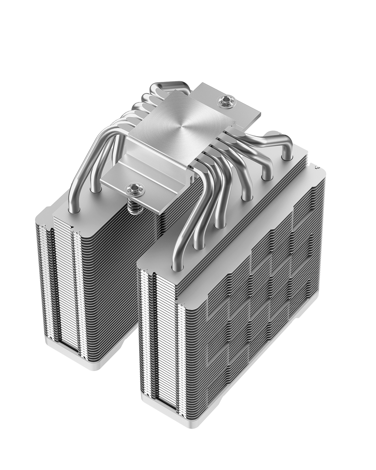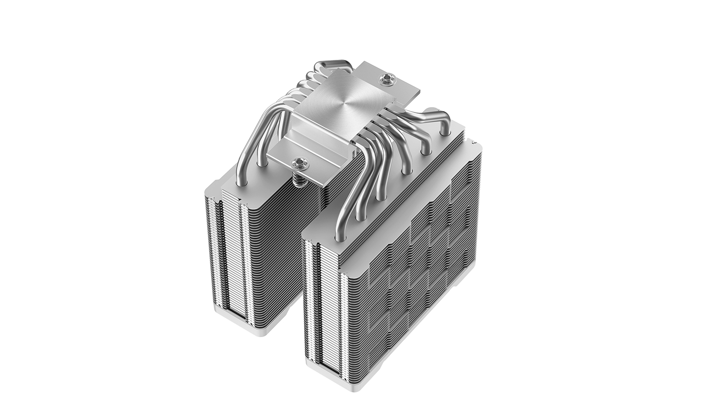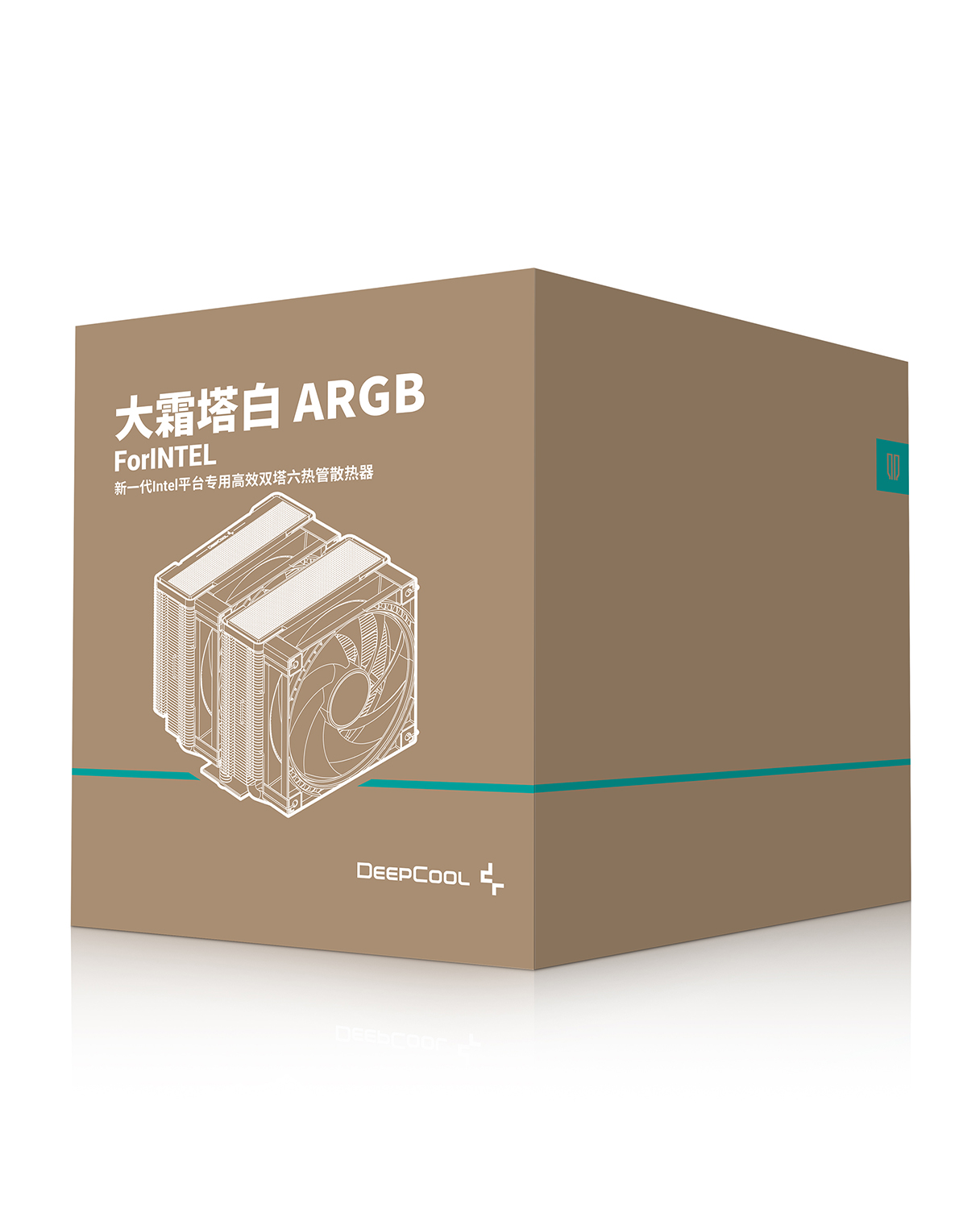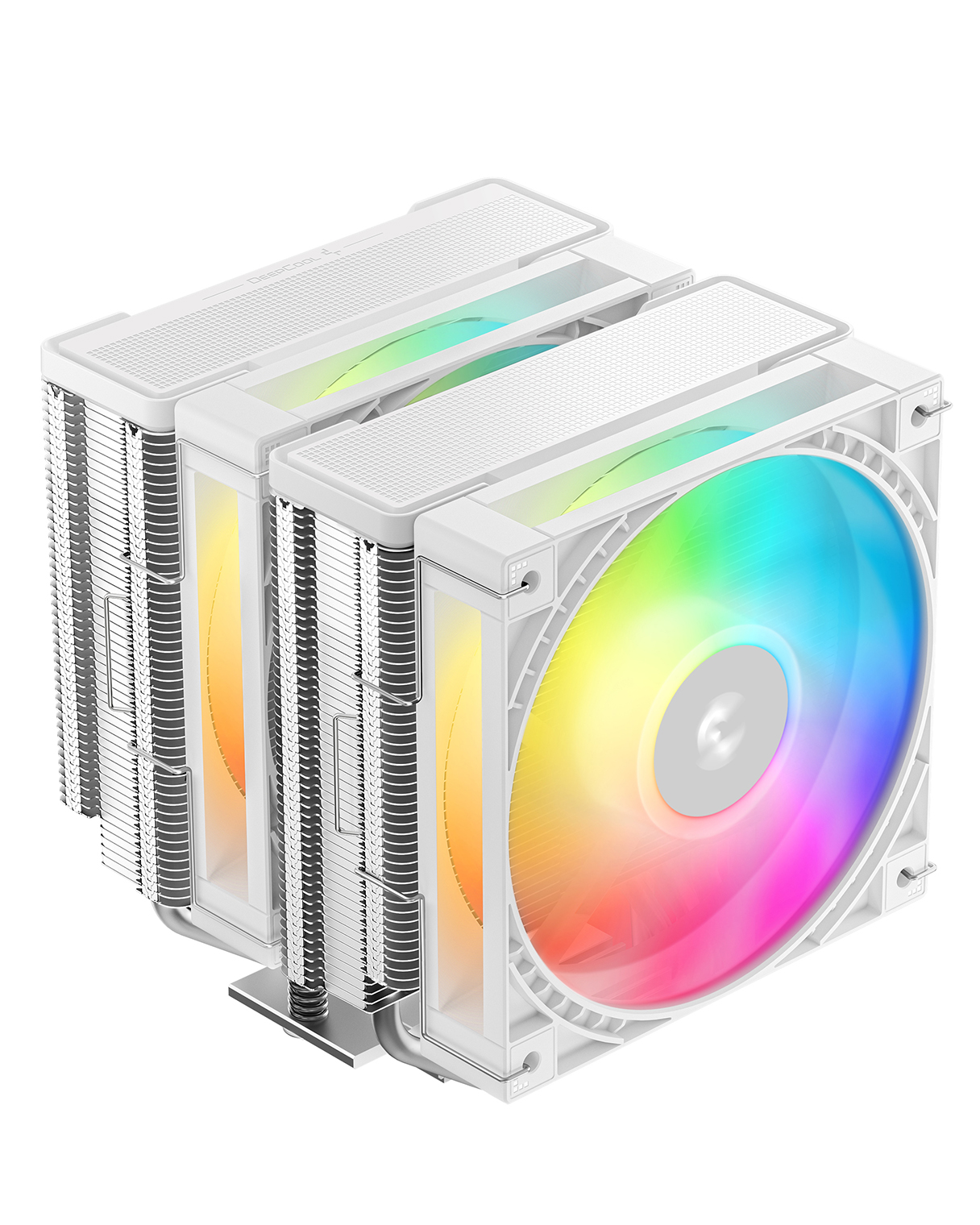 大霜塔白 ARGB FORINTEL延续上一代经典风格,同时升级家族化矩阵风格装饰顶盖,质感更出众。传承经典六热管双塔结构,镂空边框设计的ARGB风扇,助力打造动感氛围光效主机。