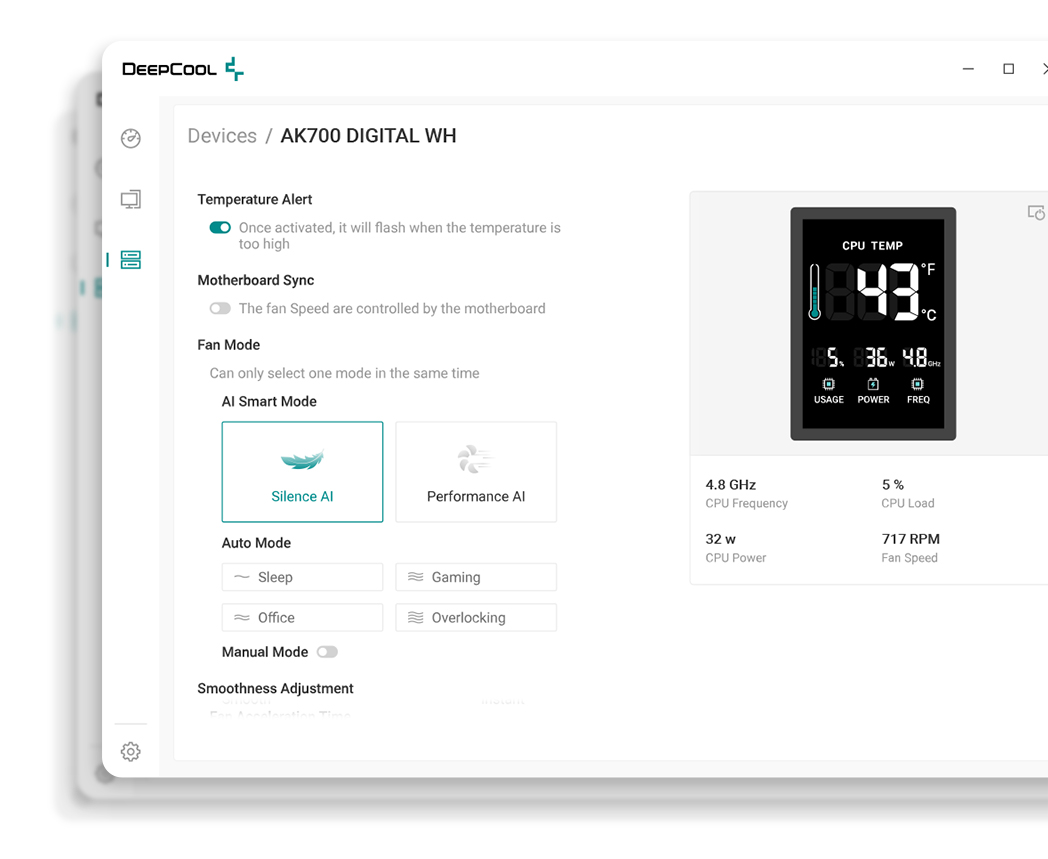 搭载 DeepCreative AI智能调节温度控制软件,无需进入主板 BIOS 反复设置,鼠标轻点即可掌控风扇转速。专属算法比主板 PWM 调节更懂硬件性能,精准捕捉 CPU 负载变化,实时匹配最优转速曲线,让散热效率与静音体验完美平衡。