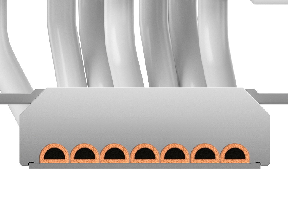 冰立方700数显 晴雪秉承经典设计,采用精密切削的平底纯铜底座和七根铜质热管,带来更强的导热能力。标志性的矩阵鳍片组配合单塔散热布局,为高性能系统提供更优的散热效率。