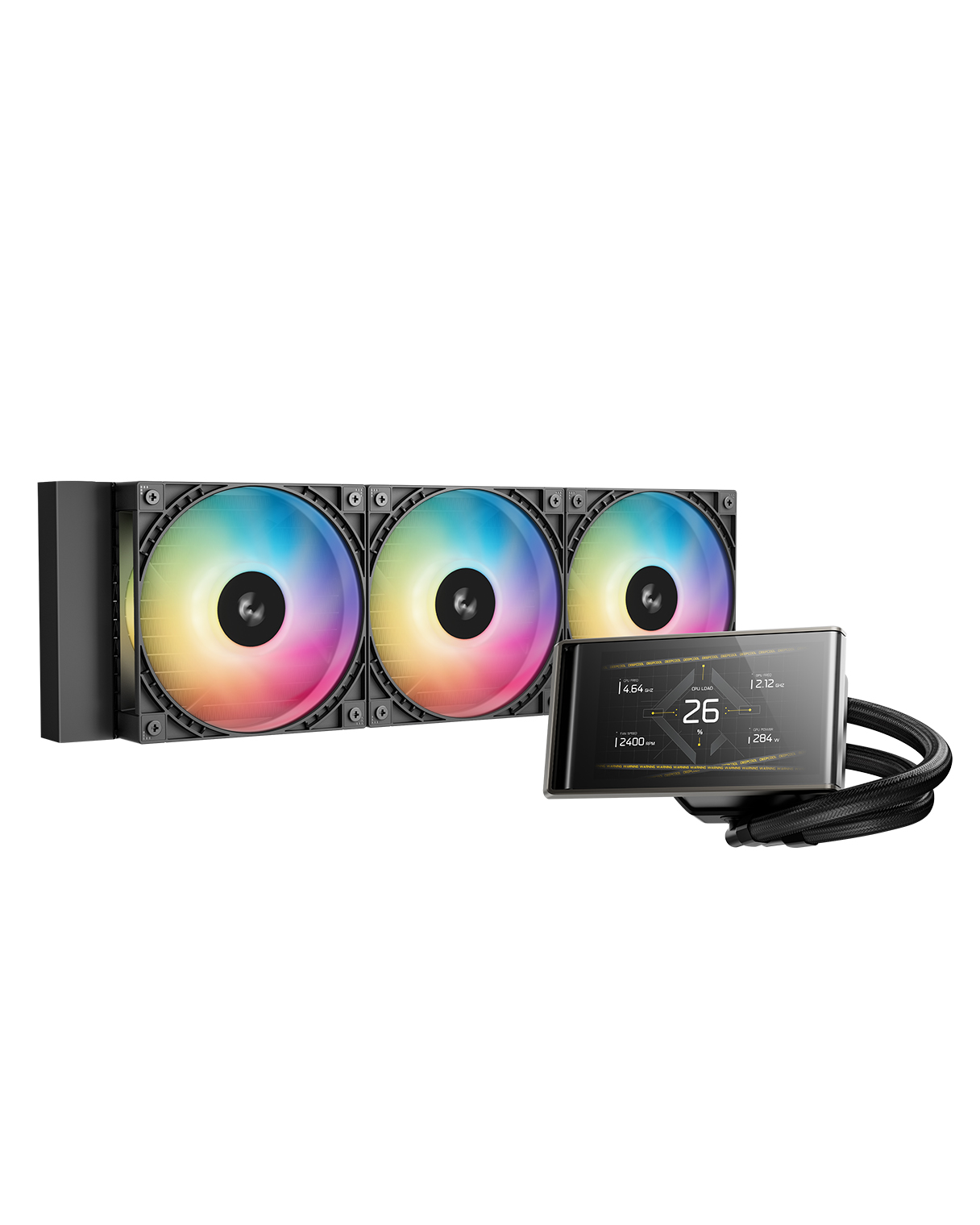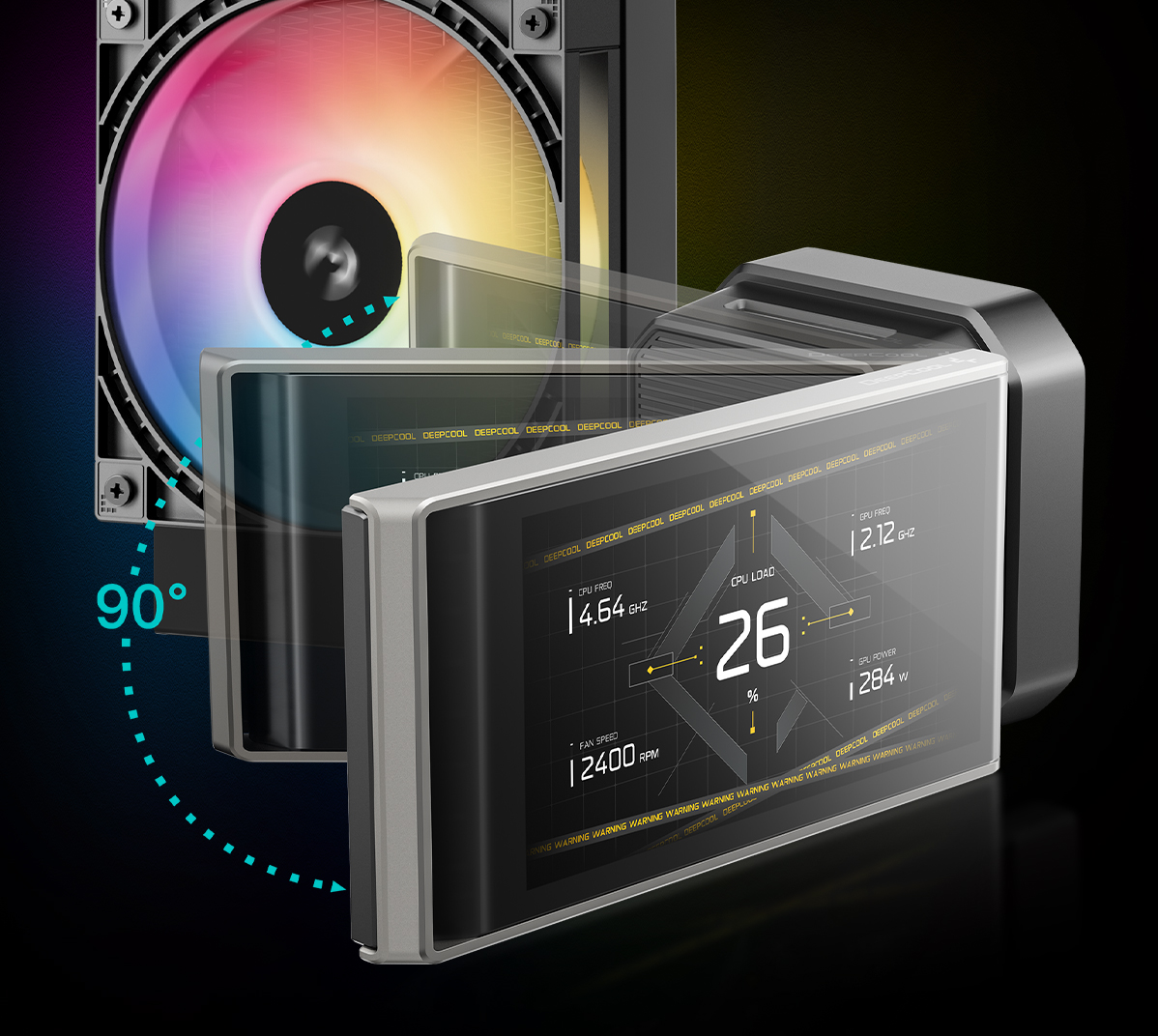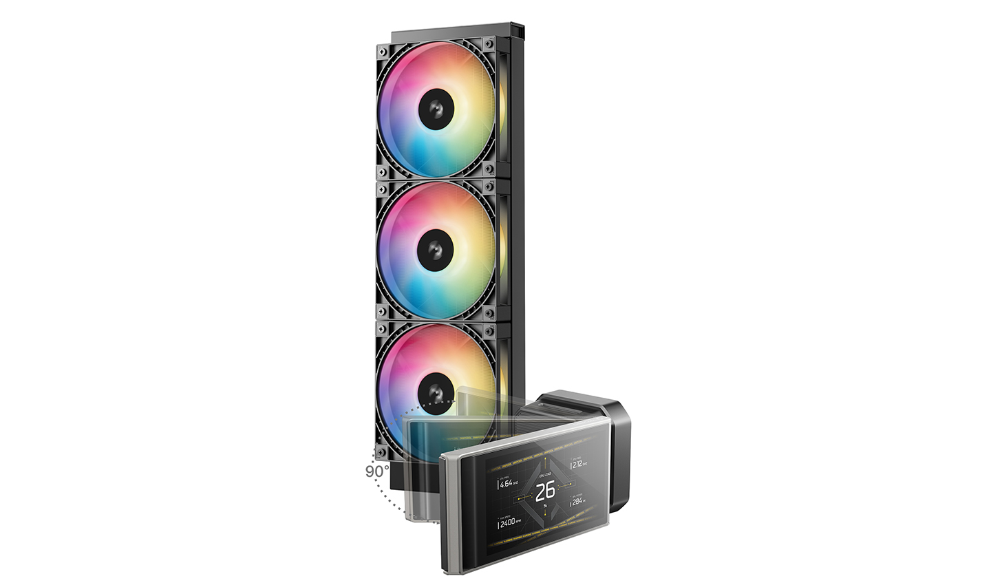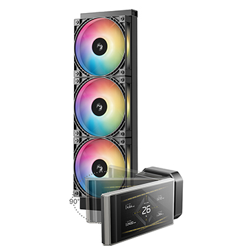 可调节的显示屏确保即使散热器未正面朝前,您仍能获得清晰的视野。屏幕安装在阻尼铰链上,可倾斜达 90°。无论是机箱被倾斜放置,还是您从侧面观看,都能将显示屏调整到最佳的观看位置。
