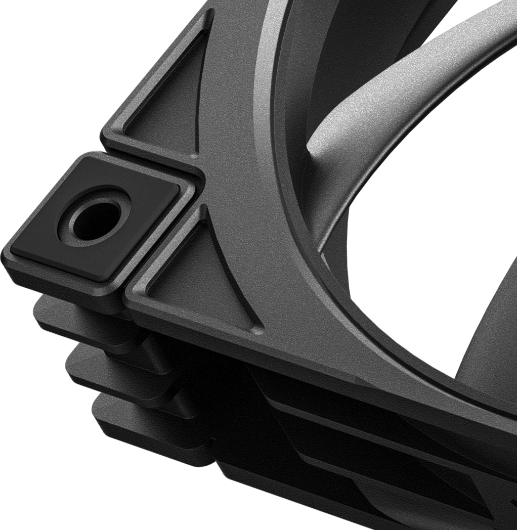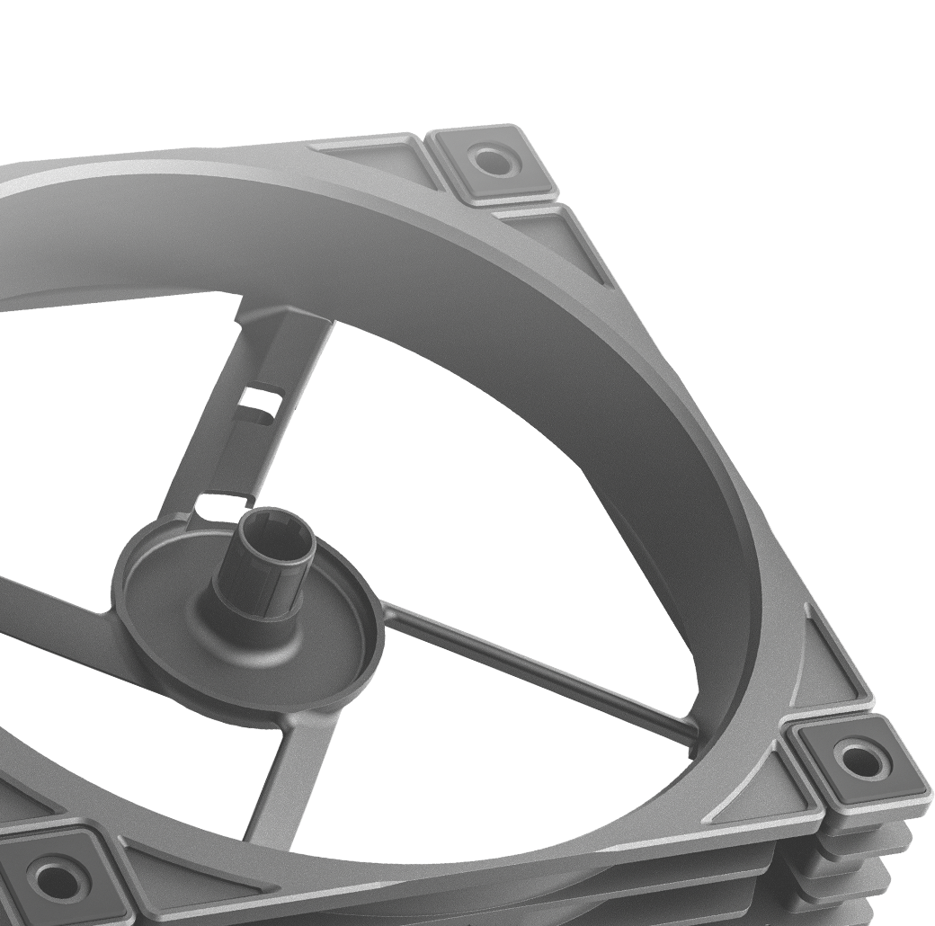 FD12 V2 三联包风扇针对扇框和扇叶结构进行优化,框体喇叭口设计和电机底座内收,使气流快速扩散,增加散热器的有效散热面积,静音环改善气流并强化了扇叶强度,从而获得更佳的耐用性和更少的振动。